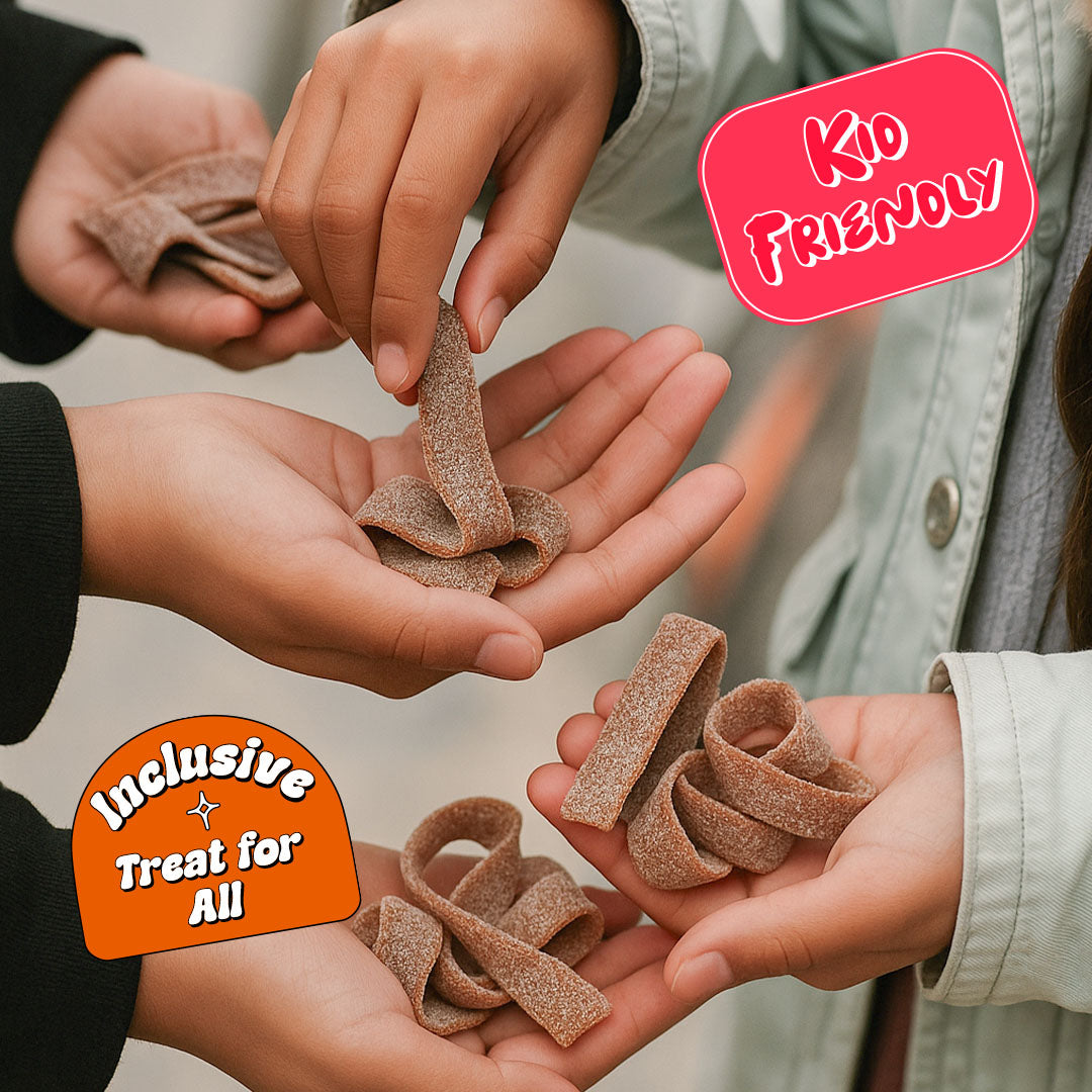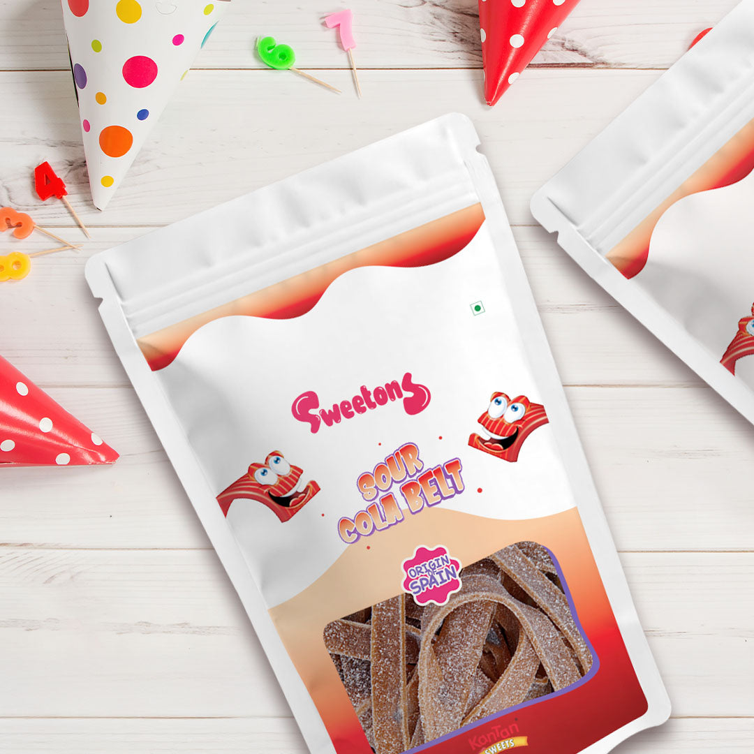 Sour Cola Candy Belts: Cola-flavoured jelly strips with a tangy sugar coating for a fizzy, nostalgic candy experience.