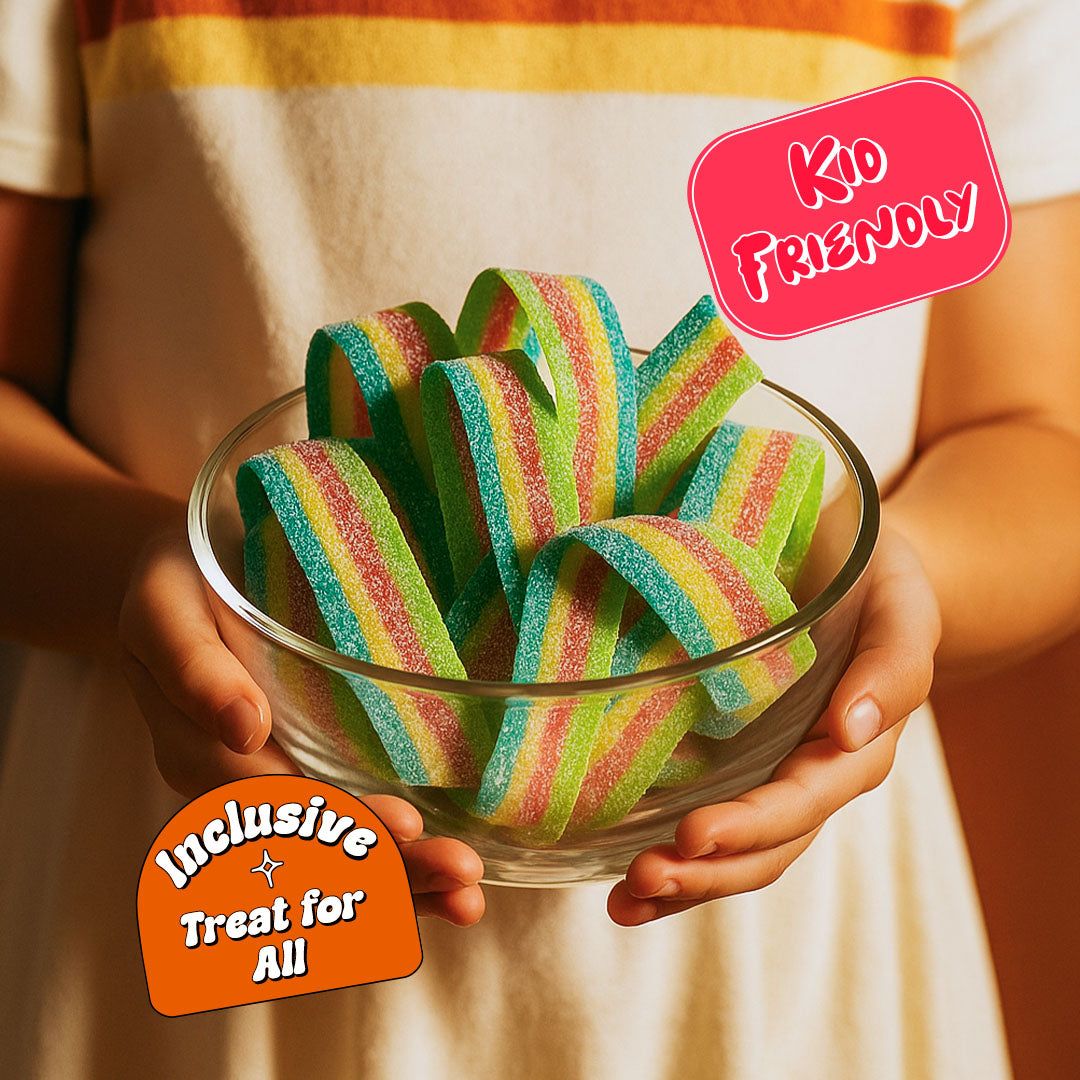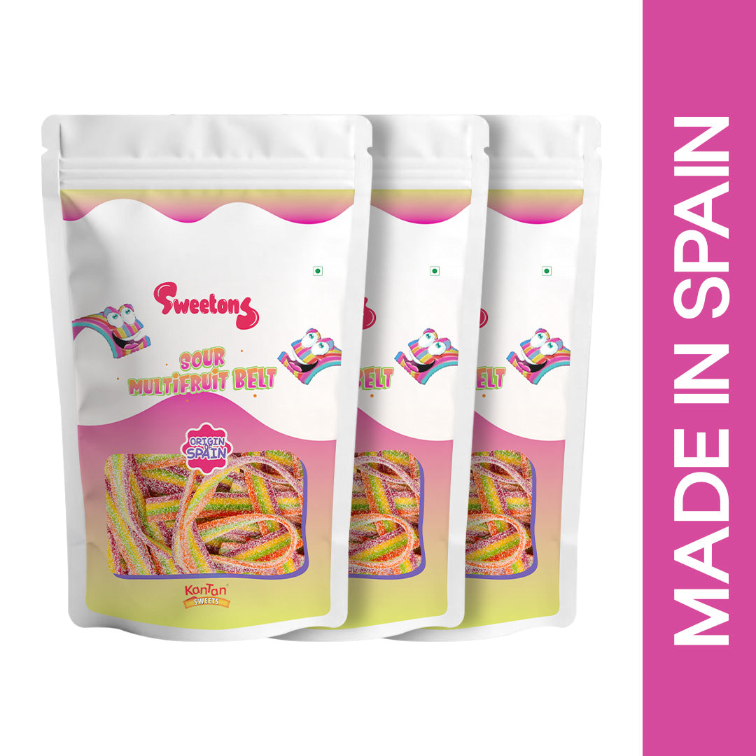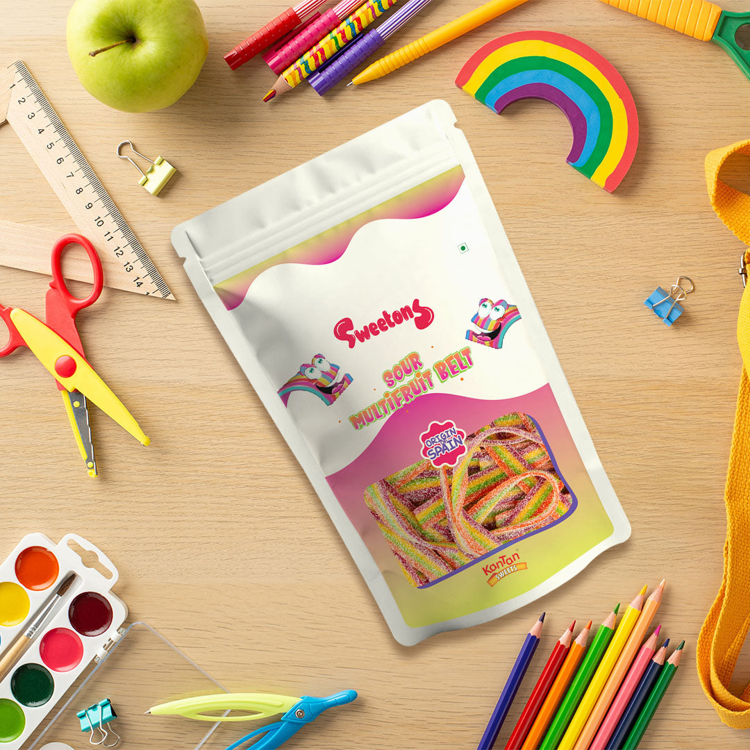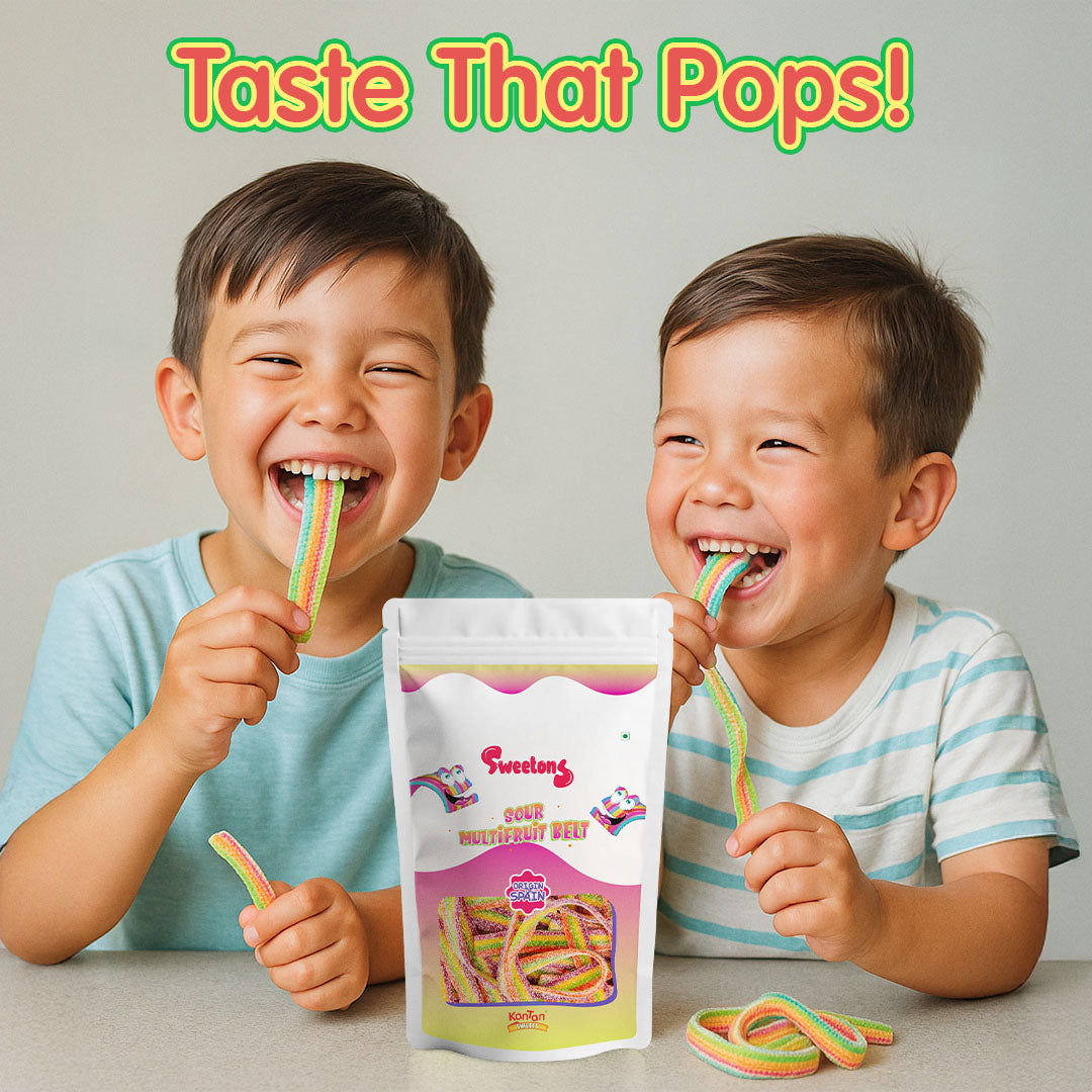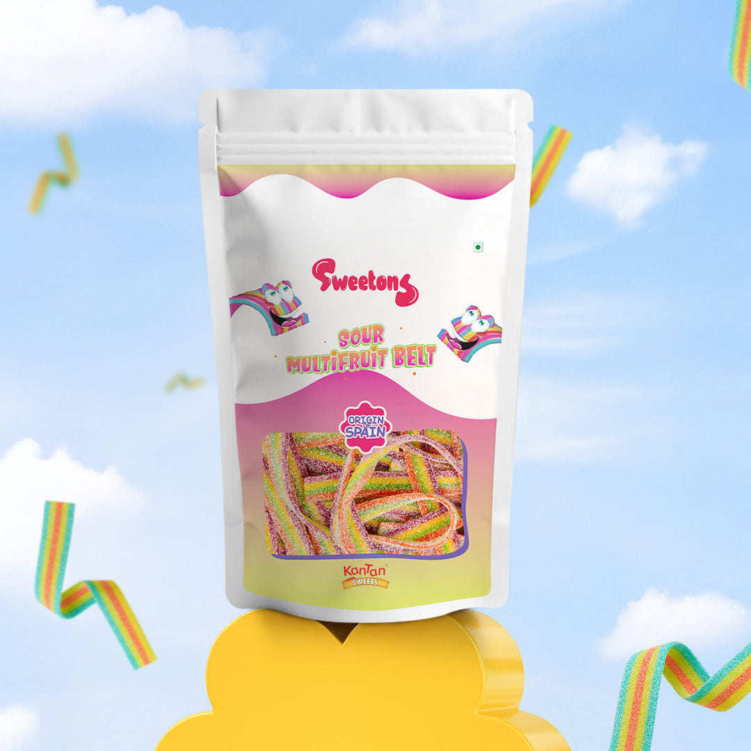 Sour Multifruit Jelly Belts: Colourful mix of tangy, sugar-coated candy strips packed with assorted fruit flavours.